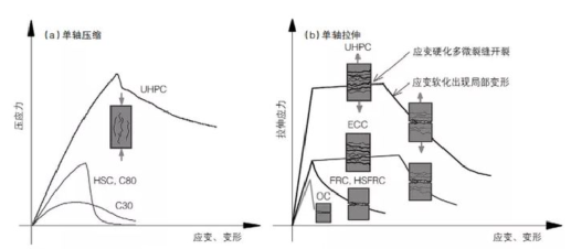 圖1 單軸拉伸和壓縮UHPC的典型應力-應變特征與其他材料對比(OC/HSC-普通/高強混凝土,